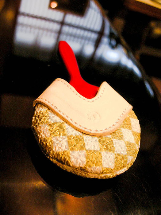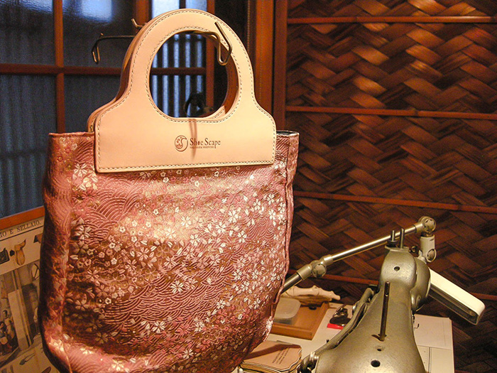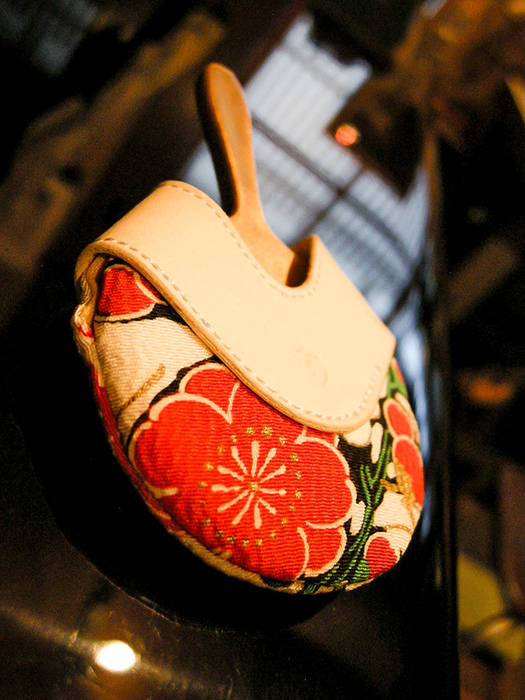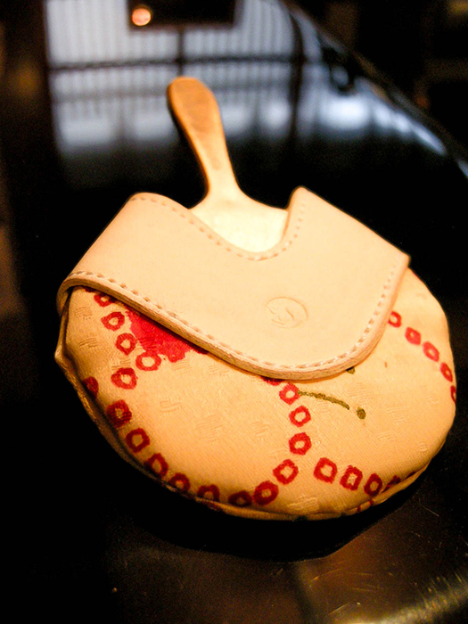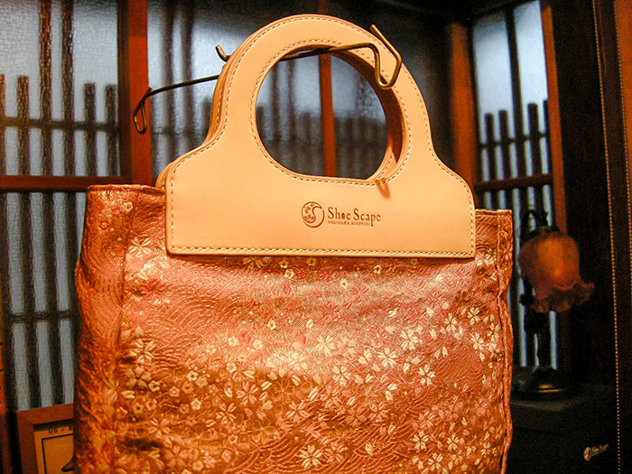 西陣織の本体にヌメ革でできた持ち手が付いています。