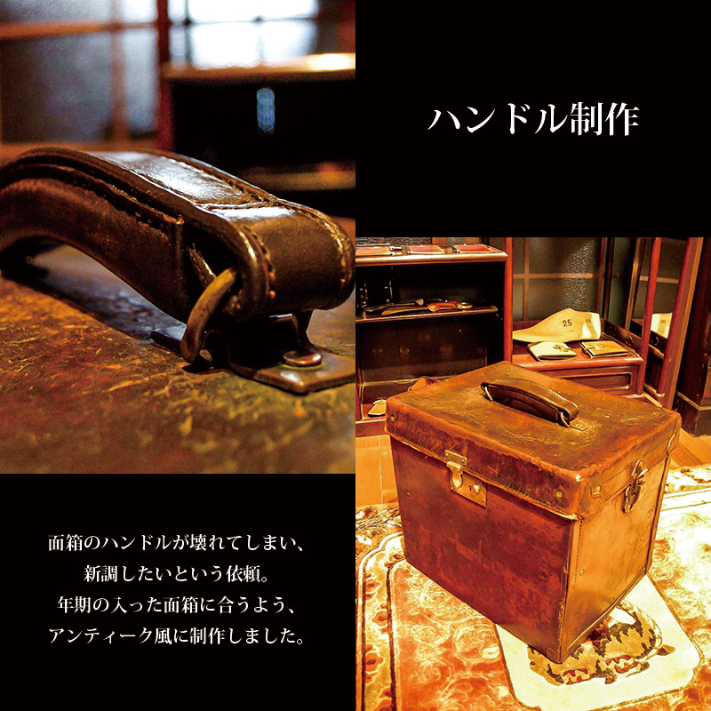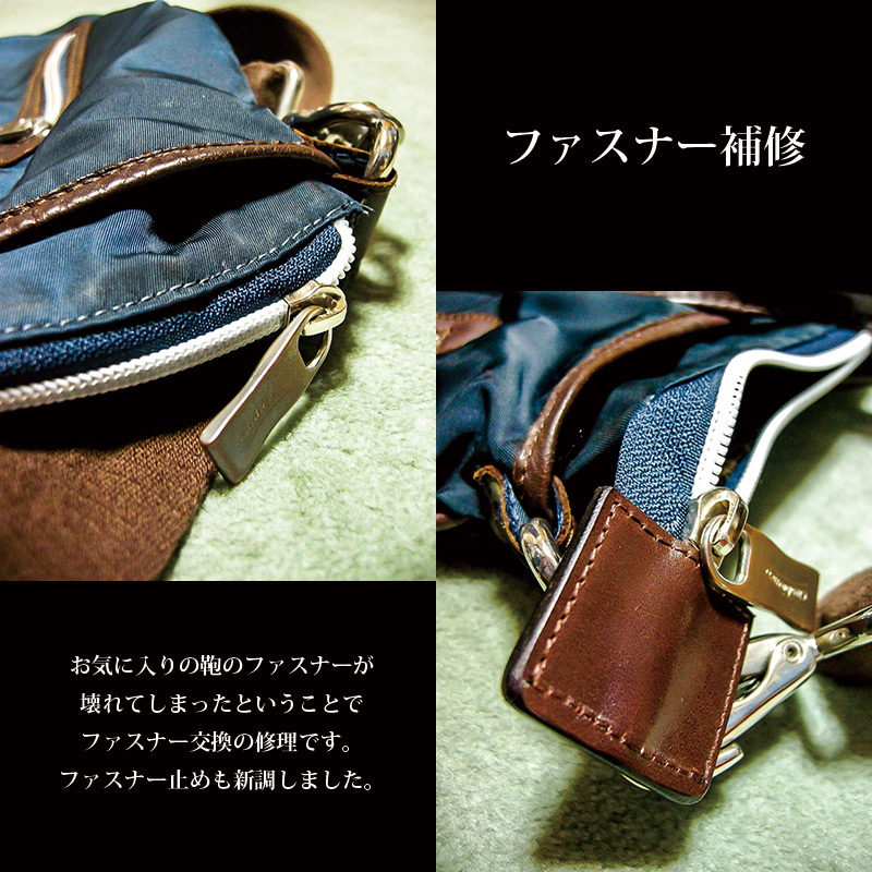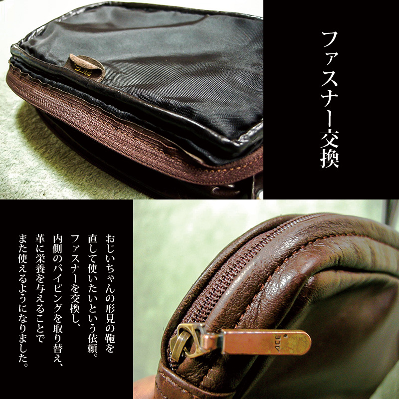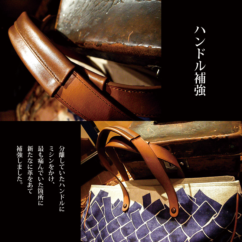 鞄の持ち手交換や補強、革張りソファーの縫い目割れ修理、ファスナー交換など、様々な革製品の修理に対応しています。 お客様の革製品の状態を見極めたうえで、ご予算に合わせて最善の修理方法を考案致します。 革製品は長く愛着を持って使えるのも魅力のひとつです。まずはお気軽にご相談ください。